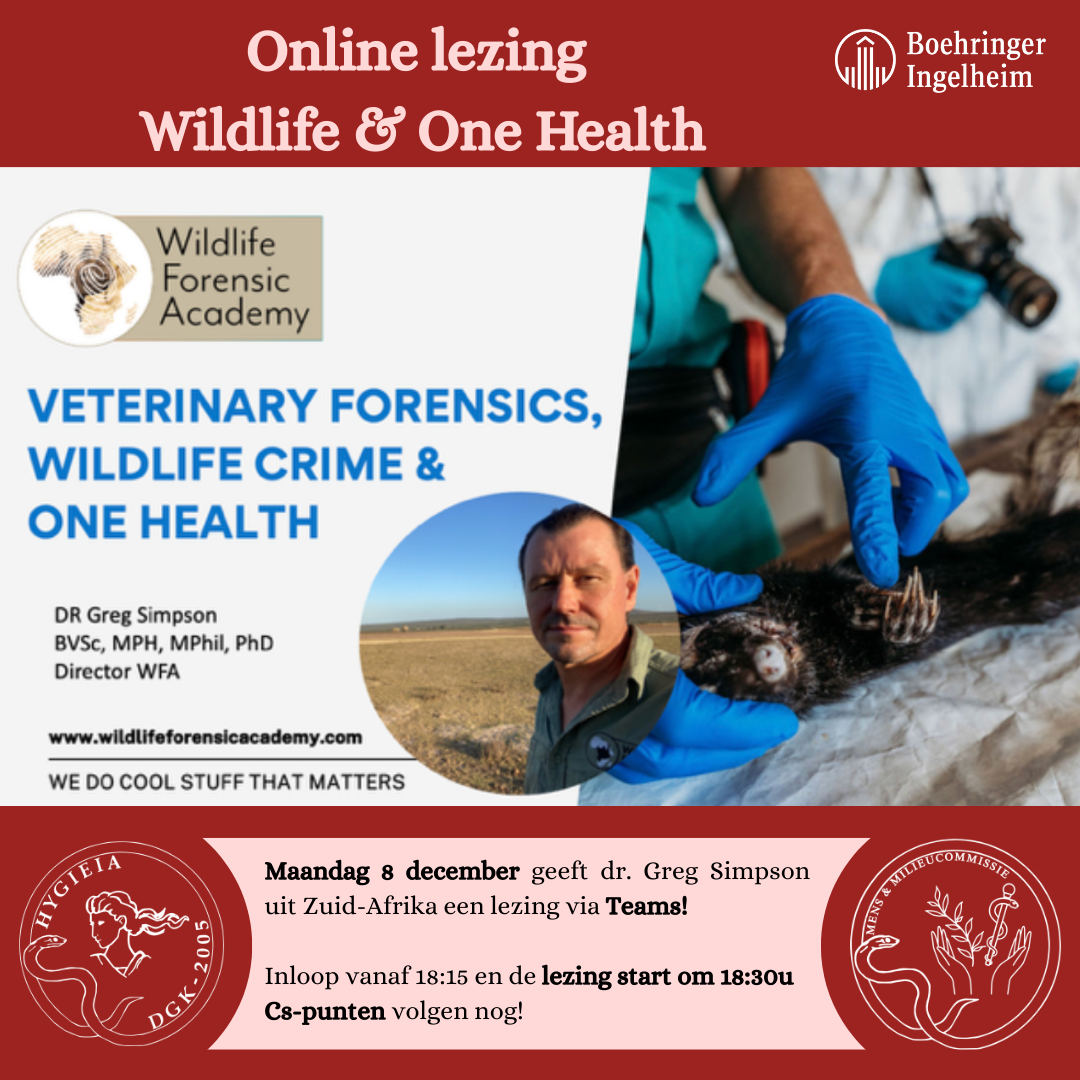 Op maandag 8 december organiseert de Mens&Milieucommissie een online lezing over Wildlife & One Health. Dierenarts Dr. Greg Simpson zal deze lezing geven! Hij is heel enthousiast om jullie te vertellen over zijn ervaringen en laat zien waarom One Health zo belangrijk is. Hij richtte een dierenkliniek op in het Kruger National Park, waar studenten leren werken midden in de natuur met beperkte middelen. Ook vertelt hij over de Wildlife Forensic Academy, die hij zelf heeft opgericht!